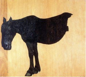 むき出しのベニヤ板に、黒い馬が上半身のみ描かれているものです。